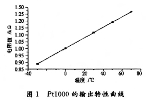 将Pt1000放入高低温实验箱中,将温度设定为-30℃~+70℃,测得温度传感器在不同温度下的电阻值,测得数据如图1所示。在测量温度范围内,Pt1000输出电阻值与温度成一定的比例关系。但是在高温和低温条件下,有一定的偏差,需要在调理电路中进行温度补偿。